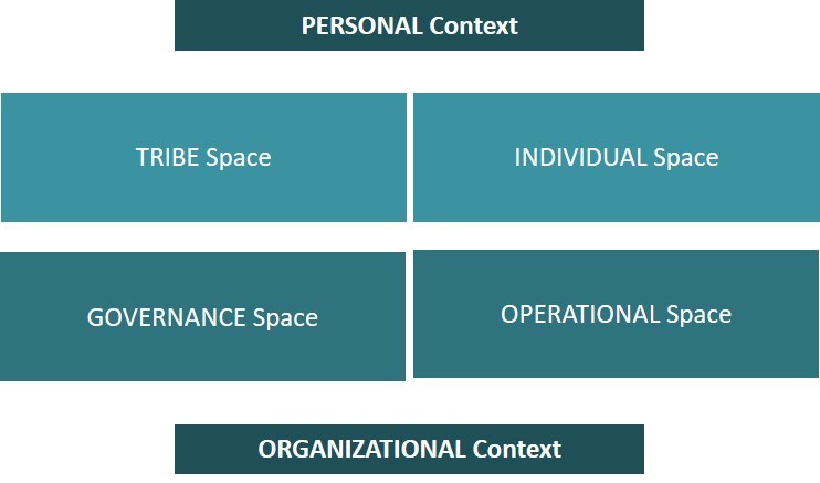 Beide Kontexte bieten verschiedene Räume für die Weiterentwicklung: Die Räume "Individual Space" und "Tribe Space" im Personal Context ermöglichen es, sich der Persönlichkeitsentwicklung und der Arbeit an zwischenmenschlichen Aspekten zu widmen (siehe Bild 1). Je nach Teilnehmerkreis erfolgen beispielsweise Reflexion und Feedback entweder im Team oder individuell. Weitere Beispiele: gemeinsame Events zur Teambildung (z.B. Ausflüge), Gruppen-Coaching, Kommunikationstrainings, Kulturarbeit und Mentoring.
