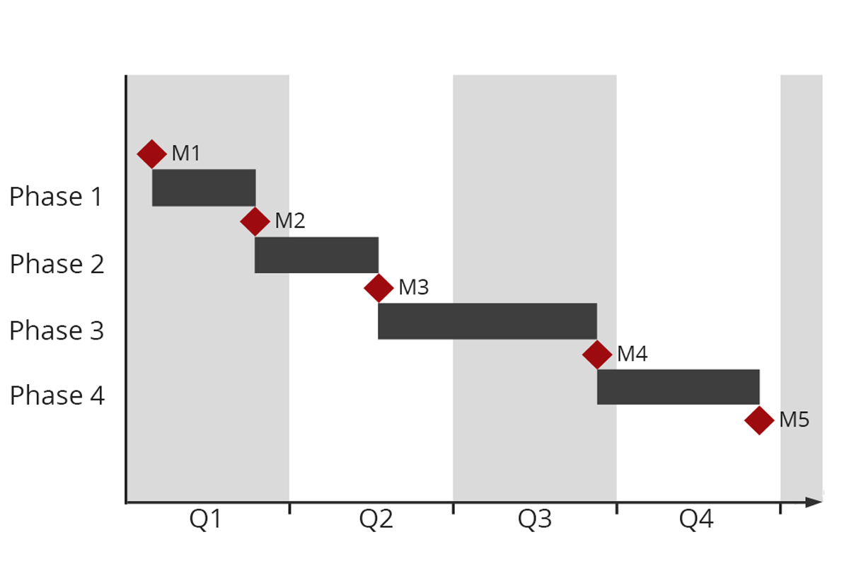 Es gibt vier zentrale Phasen: Initiieren, Planen, Durchführen, Abschließen. Die Durchführung kann selbst in mehrere Phasen gegliedert sein und umfasst das Überwachen und Steuern des Projekts. [Weiterlesen]