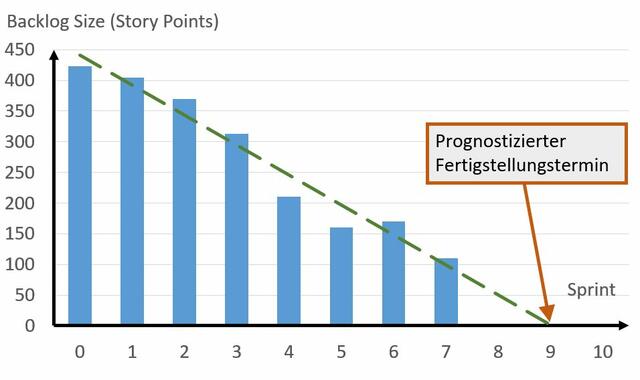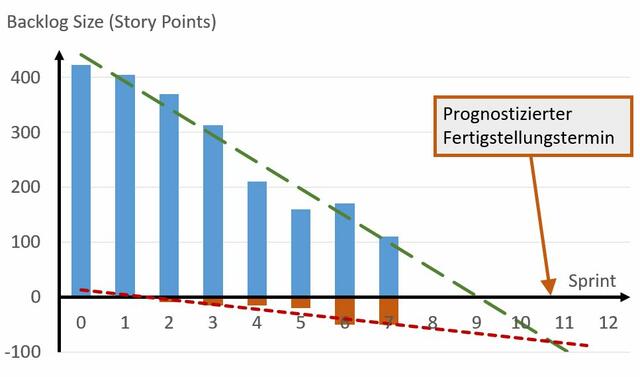 Eine weitere Möglichkeit besteht darin, neben dem Burndown-Chart zusätzlich ein sog. Burnup-Chart zu erstellen, das den Umfang der fertig gestellten User Storys visualisiert. In diesem Diagramm ist die Ziellinie eine Horizontale zur Abszisse in Höhe des geschätzten Umfangs des gesamten Product Backlogs. Diese Ziellinie kann dann entsprechend verschoben werden, wenn sich der Umfang des Backlogs ändert, ohne dass das Burnup-Chart an Aussagekraft verliert.