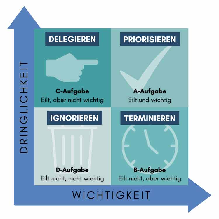 Die Priorisierung durch das Eisenhower-Prinzip sorgt für einen Fokus auf die wichtigsten Aufgaben und macht deutlich, wann welche Aufgabe bearbeitet werden soll. Dadurch entsteht eine maximale Effektivität.