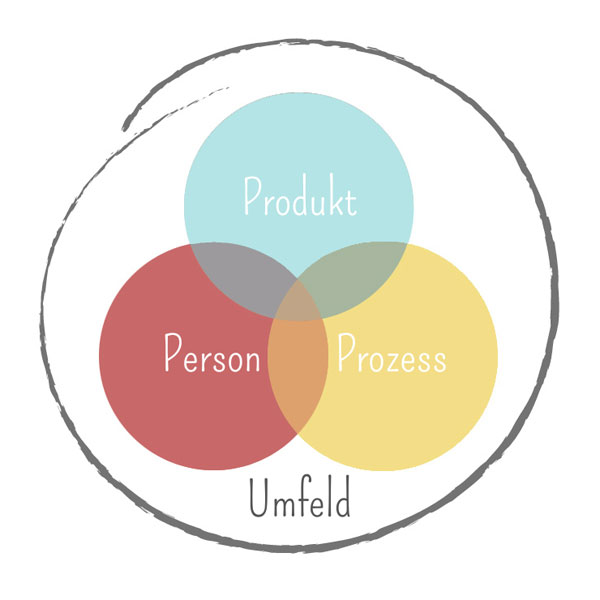 - Das kreative Umfeld: Auf der Micro-Ebene ist es die unmittelbare Umgebung der kreativen Person. Auf der Macro-Ebene wir das kreative Umfeld als kreatives Milieu bezeichnet und umfasst die gesellschaftlichen Rahmenbedingungen. Dazu gehören Raum und Zeit, um Ideen entwickeln zu können, Stimuli, die zu Kreativität anregen, Material, um die Ideen festzuhalten und ein kreatives Klima.