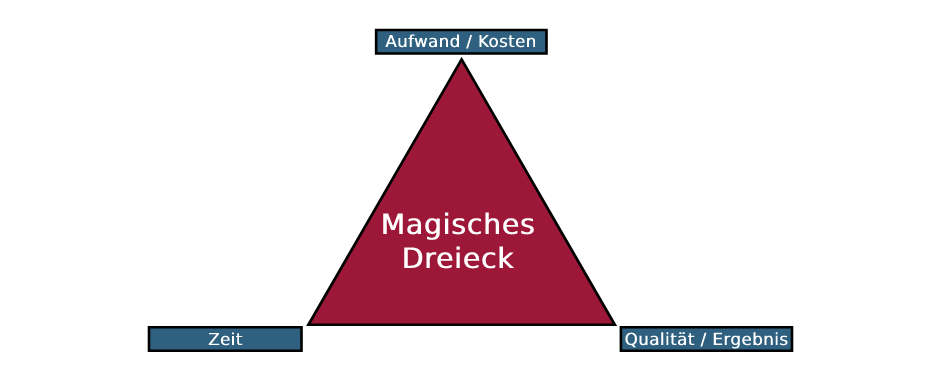 Das Magische Dreieck besteht aus den miteinander verknüpften Dimensionen Ergebnis, Aufwand und Zeit. Diese drei Faktoren sind Variablen und stehen jeweils für die Eckpunkte des Dreiecks. Sie beeinflussen sich gegenseitig: Wird innerhalb eines Projekts ein Faktor verändert, müssen auch die anderen beiden Variablen angepasst werden, damit das Dreieck weiter funktioniert.