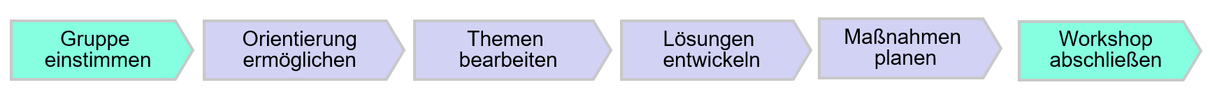 - Struktur: Überlegen Sie sich für den Aufbau des Workshops eine klare und für den Kreis der Teilnehmenden nachvollziehbare Struktur auf Basis der sechs Prozessschritte.