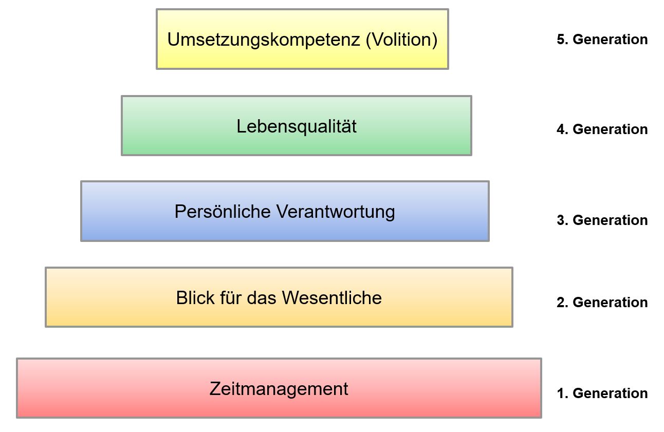 Nach Stephen Covey (Covey, 2014), einem der Pioniere des Selbstmanagements, lassen sich vier Generationen des Selbstmanagements unterscheiden, die inzwischen durch eine fünfte Generation ergänzt werden (Bild 1).