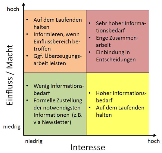 Für eine genaue Analyse der Stakeholder:innen kann eine Matrix angelegt werden. In diesem Rahmen werden die Stakeholder:innen analysiert, welche für ein Vorhaben bzw. ein Projekt am wichtigsten sind. Mit einbezogen werden dabei die jeweiligen Interessen, die Macht, die Haltung und der Einfluss. In der Matrix werden die Eigenschaften der Stakeholdergruppen relativ zueinander in einem XY-Graph abgebildet.