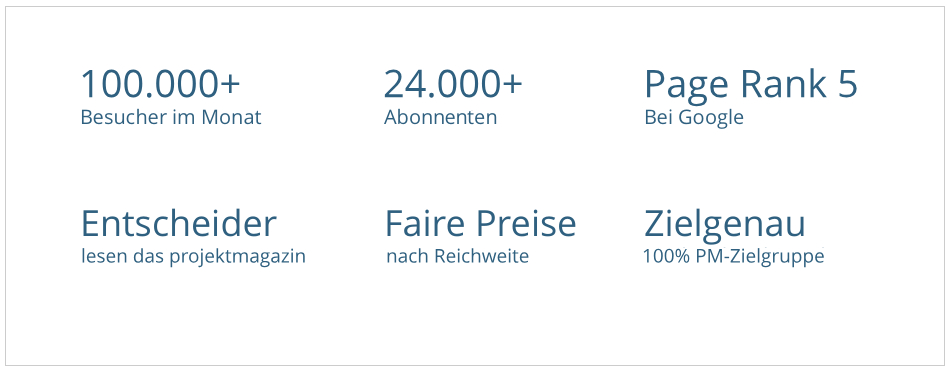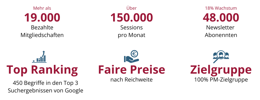 Mit über 19.000 Mitgliedern und rund 150.000 Besuchern im Monat sind wir der Marktführer im Raum D/A/CH und das reichweitenstärkste Medium für Projektmanagement-Themen.