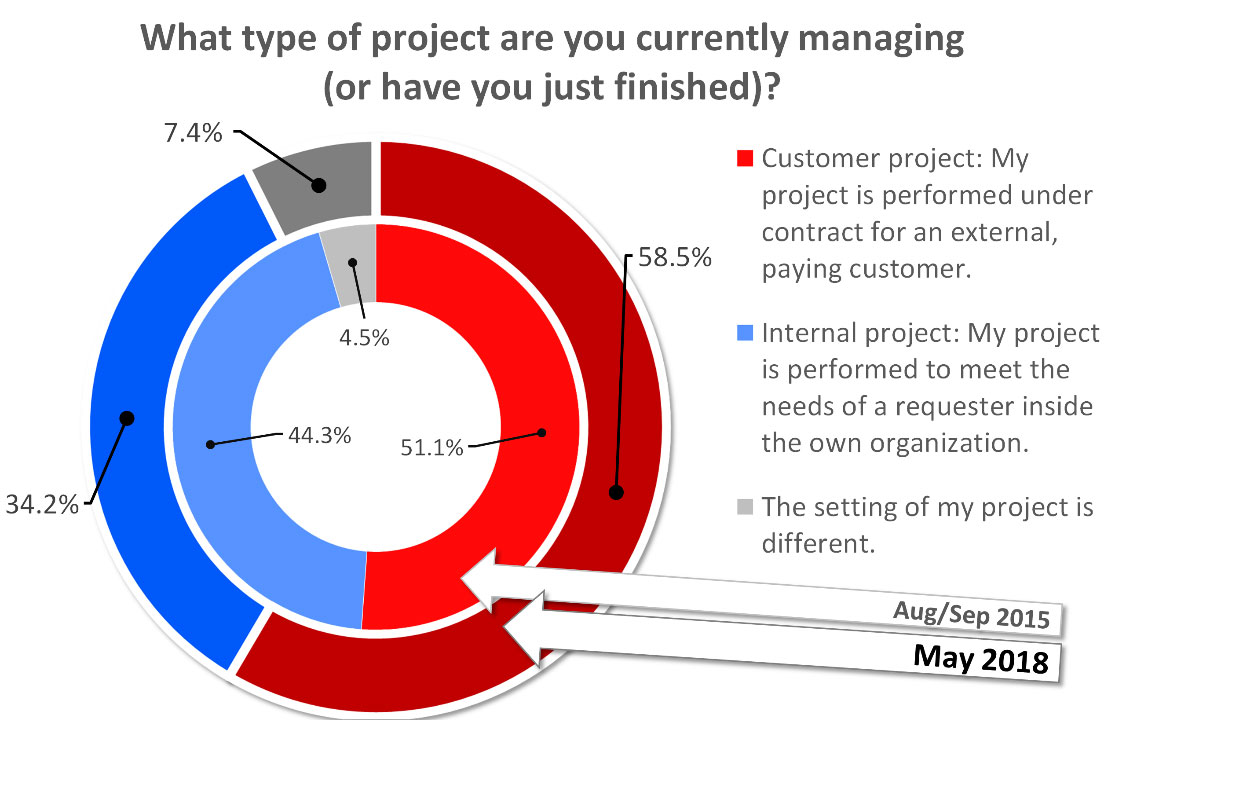 2015 war eine leichte Mehrheit von Projektmanagern in Kundenprojekten erkennbar, die aber vielleicht unserer nicht repräsentativen Teilnehmerauswahl geschuldet war. Die Umfrage 2018 bestätigte das Ergebnis aber, und der Anteil von Projektmanagern in Kundenprojekten war noch höher. Das lässt sich nur noch schwer durch Zufall erklären.