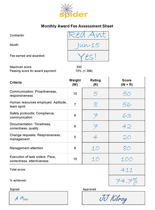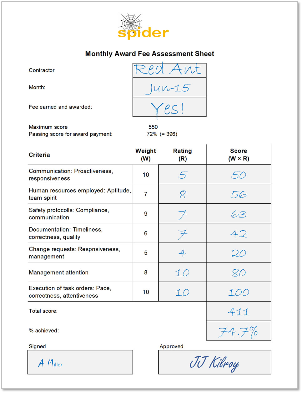 Award Fee kann man mit "Begeisterungsprämie" übersetzen. Sie ist nicht einklagbar, gibt dem Lieferanten aber unmittelbar Rückmeldung dazu, wie der Kunde seinen Einsatz einschätzt. Dieser Vertragstyp belohnt Lieferanten, wenn sie das Projekt aktiv unterstützen.