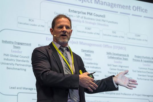 Auf die gewohnt herzliche Begrüßung durch Regina Wolf-Berleb und Petra Berleb folgte sofort die erste Keynote des Tages: Stephen M. Markgraf präsentierte in seinem Vortrag Managing Project Complexities – Insights to Boeing’s Enterprise Project Management, wie Projektmanagement den Geschäftserfolg von Boeing verbessert.