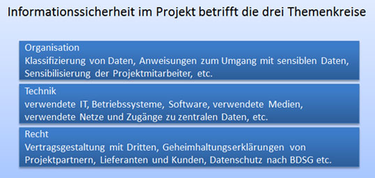 Deshalb ist es in Projekten mit ihrer höheren Dynamik meist noch schwieriger, die verwendeten Daten gegenüber unberechtigten Zugriffen abzusichern, als es das in Unternehmensorganisationen ist. Hinzu kommt die Tatsache, dass besonders die in Projekten erarbeiteten Ergebnisse und neuen Erkenntnisse sehr wertvoll sein können – für Auftraggeber, Kunden und eben auch für Dritte.