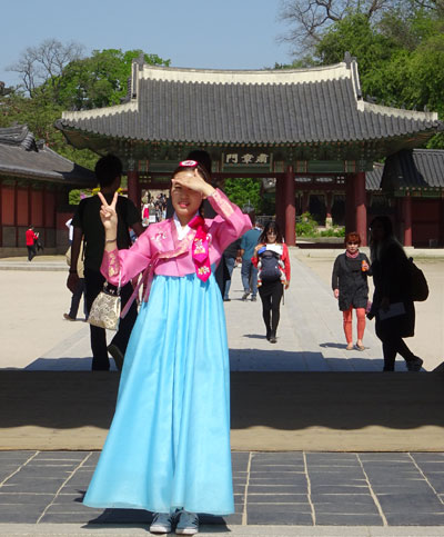 Bild 1: Junge Koreanerin in traditioneller Kleidung posiert vor der Tempelanlage Changdeokgung.