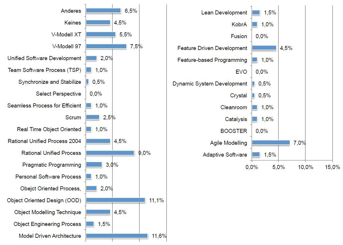 RUP führt in Kombination mit der 2004-Version das Ranking mit 13,5% an, stark bedrängt vom V-Modell XT, das gemeinsam mit der 97-Version auf 12% kommt. Scrum liegt noch bei beschaulichen 2,5%. Wichtig ist bei der Interpretation der Ergebnisse der Verweis von Kuhrmann und Linssen, dass in vielen Fällen keine "richtigen" Vorgehensmodelle genannt wurden, sondern vielmehr einzelne Methoden, wie z.B. OOD, OMT oder MDA.