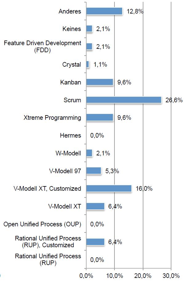 Auch bei dieser Befragung waren Mehrfachnennungen möglich, allerdings wurde für die Teilnehmer die Menge der Vorgehensmodelle eingeschränkt, die sie angeben konnten. Scrum schießt im Vergleich zur älteren Studie mit mehr als einem Viertel der Nennungen förmlich durch die Decke. Das V-Modell kommt sowohl in der XT- als auch der 97-Version auf satte 27,7%. Somit machen Scrum und das V-Modell mehr als 50% der Angaben aus. Daneben wurde die Option "Anderes" häufig genannt, zu den hier angegebenen Vorgehensmodellen zählten u.a. Test Driven Development oder eigene Kreationen.