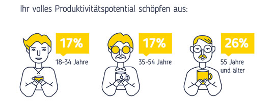 Glaubt man den Einschätzungen der Befragten, scheint die Generation 55+ belastbarerer und produktiver zu sein als die "Generation Y". Die älteren Studienteilnehmer schätzen den Anstieg in der Arbeitsbelastung innerhalb des letzten Jahres deutlich geringer ein als die jüngeren Teilnehmer. Nur 19% werten die Zunahme als signifikant, bei den 18- bis 34-Jährigen sind es 26%. Mitarbeiter, die 55 Jahre oder älter sind, schätzen zudem die eigene Produktivität höher ein: maximal produktiv arbeiten laut eigener Einschätzung 26%, hingegen glauben nur 17% der Generation Y, dass sie das tun. Das sind im übrigen genauso viele – oder in dem Fall eher genauso wenige – wie bei den 35-54-Jährigen (siehe Bild 2).