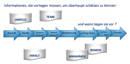 Je früher der Zeitpunkt im Projekt, desto schwieriger ist es, den Aufwand genau zu bestimmen! Oft ist es nicht möglich, länger zu warten oder mehr Informationen zu beschaffen. Dazu kommt die Tatsache, dass ein nur Hinzunehmen von Informationen nicht automatisch die Schätzung verbessert. Eine zu frühe bzw. grobe Schätzung trägt das Risiko hoher Fehlerwahrscheinlichkeit in sich.