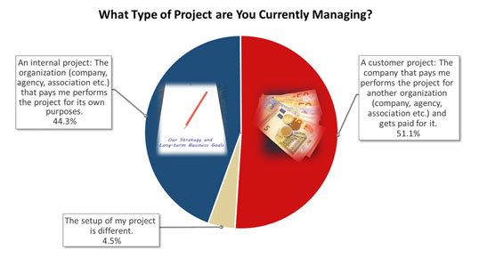 Bild 1 zeigt die Ergebnisse einer Befragung, die ich im September 2015 mit 246 internationalen Projektmanagern durchgeführt habe. Auf die Frage, ob sie aktuell in einem internen Projekt oder in einem Kundenprojekt tätig sind, antworteten über die Hälfte mit "Kundenprojekt". Projektmanagement als kommerzielles Geschäft, von dessen Einnahmen Unternehmen leben und ihre Mitarbeiter bezahlen müssen, ist also alles andere als eine Randerscheinung. Bei meiner Recherche, wie sich der Markt international entwickelt, konnte ich zudem ein sehr robustes Wachstum verzeichnen (weitere Informationen dazu).