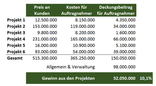 Ein Unternehmen, das sein Einkommen damit erwirtschaftet, Projekte für Kunden gegen Rechnungsstellung durchzuführen, hat ein laufendes Portfolio an Kundenprojekten auf Festpreisbasis, das einen Gewinn von circa 10% des Umsatzes verspricht. Dies wird in Tabelle 1 ersichtlich.