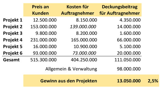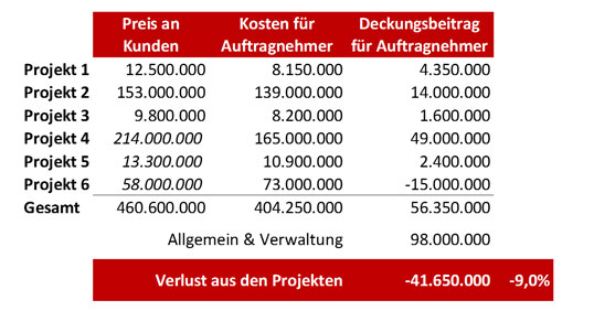 Eine solche Belastung während des Kundenprojekts sind eventuell berechtigte Unzufriedenheiten, Vertragsstrafen, Haftungsforderungen und ähnliche Gründe, die zu einer Reduktion des Festpreises führen. Im Beispiel sind die Projekte 4, 5 und 6 davon betroffen, wie Tabelle 3 zeigt.