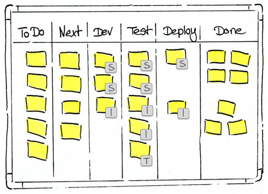 Er nahm Schwamm und Whiteboard-Marker und änderte das Board-Design. Die "Swim Lanes" für die einzelnen Kollegen waren jetzt verschwunden. Stattdessen hatte er durch Avatare visualisiert, wer gerade an welcher Aufgabe arbeitet. Aufgaben, die noch nicht begonnen waren, wurden auch noch keiner Person zugeordnet.