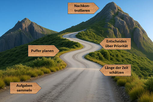 Auch diese Darstellung verwendet die ALPEN-Methode in einem erweiterten Sinne. Ursprünglich war sie ausschließlich für die individuelle Tagesplanung vorgesehen. Die fünf generischen Schritte:
