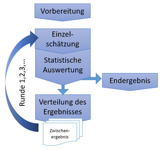 Die Delphi-Methode wird in mehreren Runden durchgeführt, um nach der Abstimmung von Zwischenergebnissen ("Rückkopplung") zu einem Endergebnis zu kommen, das einen Konsens der schätzenden Personen darstellt. Für die Bewertung der Genauigkeit der Zwischenergebnisse werden statistische Größen verwendet.