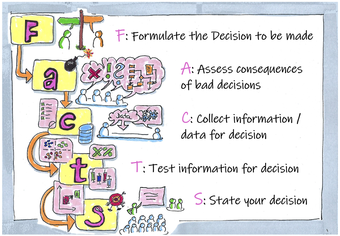 FACTS ist ein Framework zur Entscheidungsfindung, das mit einer klaren Struktur die Annahmen transparent darlegt, unter denen die Entscheidung getroffen wird. Die Methode hilft dabei, auch in kritischen und vor allem unklaren Situationen den Entscheidungsprozess sorgfältig vorzubereiten, abzuarbeiten sowie nachvollziehbar zu dokumentieren. Das Akronym "FACTS" steht für "Formulate-Assess-Collect-Test-State".