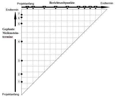 - Prognoselinien der Meilensteine des Projekts in Form eines MTA-Diagramms
