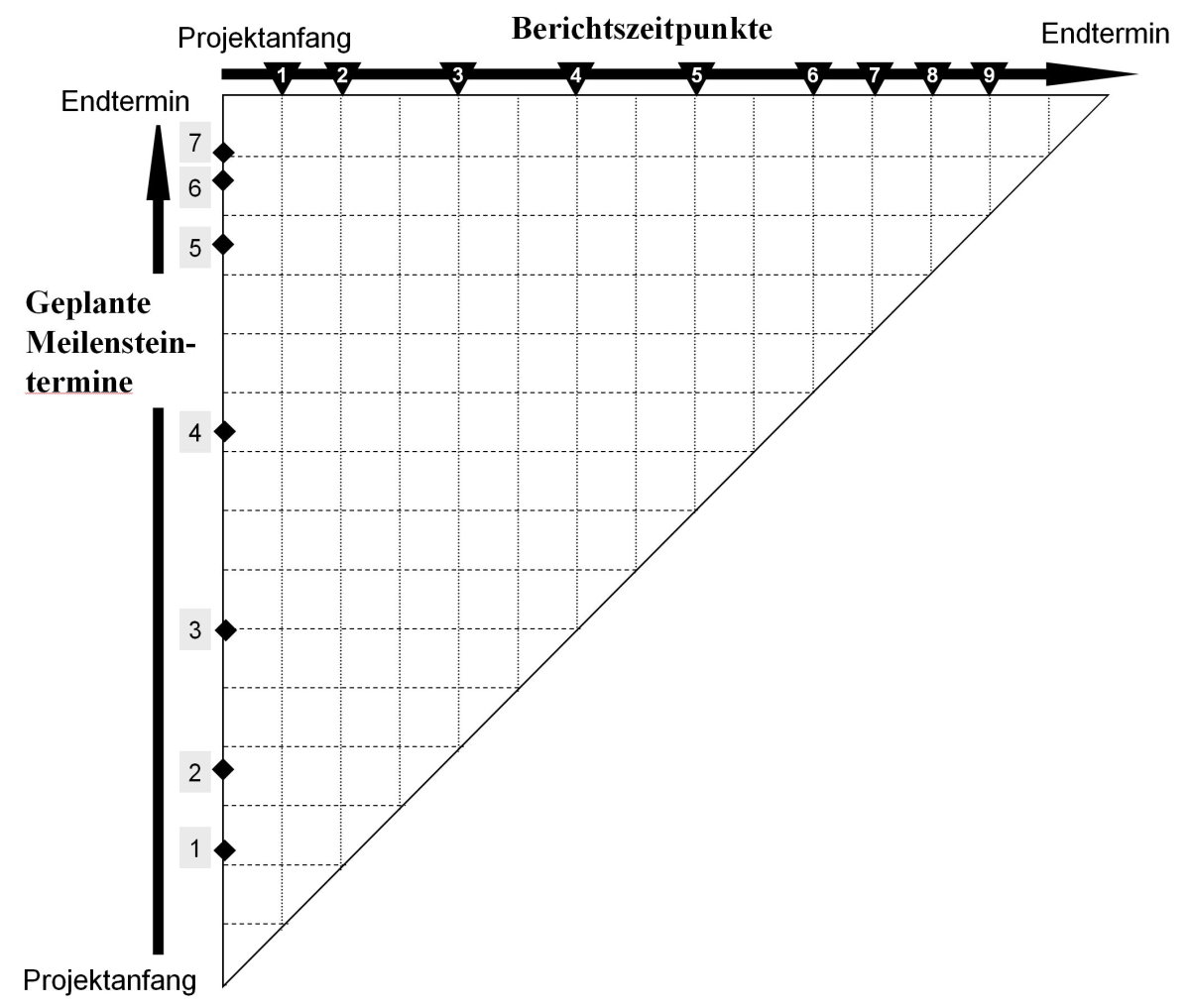 Bild 1: Das MTA-Diagramm bildet ein rechtwinkliges Dreieck. Nach rechts sind die Stichtage für die Überwachung eingetragen, nach oben die geplanten Meilensteintermine.