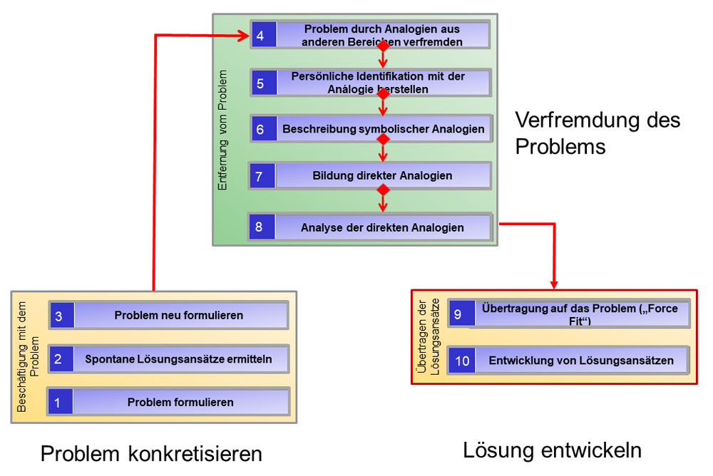 Die letzten beiden Schritte "Übertragung auf das Problem", "Entwicklung von Lösungsansätzen" dienen dazu, diese Analogien wieder auf das Problem zu beziehen und daraus einen Vorschlag für das Problem oder das Thema zu erarbeiten. Der Prozess ist in Bild 1 dargestellt.