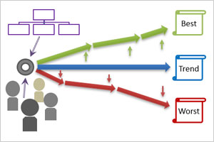 Die Szenariotechnik entwickelt anhand von Annahmen und der Analyse möglicher Einflussfaktoren Prognosen für den zukünftigen Projektverlauf. Eine positive Projektion (Best Case) zeigt den idealen Verlauf unter günstigen Annahmen, eine negative Prognose (Worst Case) die Entwicklung unter denkbar ungünstigen Annahmen. Weitere Szenarien sind möglich, z.B. eine Trendprojektion, die den vermuteten wahrscheinlichsten Verlauf abbildet. Die Analyse und Bewertung der Szenarien dient zur Entwicklung von Strategien und Maßnahmen für das weitere Vorgehen.