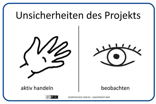 Im Gegensatz dazu sammelt die rechte Seite (unter dem Augensymbol), Ereignisse, die in der Zukunft liegen und deren Eintreten durch die Projektakteure nicht beeinflussbar ist. Dies sind tatsächliche Unsicherheiten im Sinne der BWL bzw. Risiken im Sinne des Risikomanagements! Da diese Situationen noch nicht eingetroffen sind und ihr Eintreffen auch nicht in der Hand der Akteure liegt, können sie lediglich beobachtet werden. In tatsächlichen Unsicherheiten liegen Chancen und Bedrohungen, je nachdem, ob von dem Eintreten des unsicheren Ereignisses eine überwiegend positive oder negative Wirkung erwartet wird. Mögliche Punkte, die in diese Kategorie fallen sind: