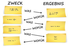 Hinweis: Wenn Sie jemanden fragen: "Warum machen Sie dieses Projekt?", werden Sie in den meisten Fällen nicht einen Grund (z.B.: "Wir haben Kunden verloren"), sondern einen Zweck (z.B. "Wir wollen Kunden gewinnen") genannt bekommen. Die Fragen nach dem "Warum" ist genau genommen in die Vergangenheit gerichtet und untersucht die Ursachen, während die Frage "Wozu" in die Zukunft gerichtet ist und die gewünschte Wirkungen ermittelt. Je nach Unternehmenskultur und Projektszenario kann es sinnvoll sein, eher "Warum" oder eher "Wozu" zu fragen – oder eben auch beide Fragen miteinander zu kombinieren.