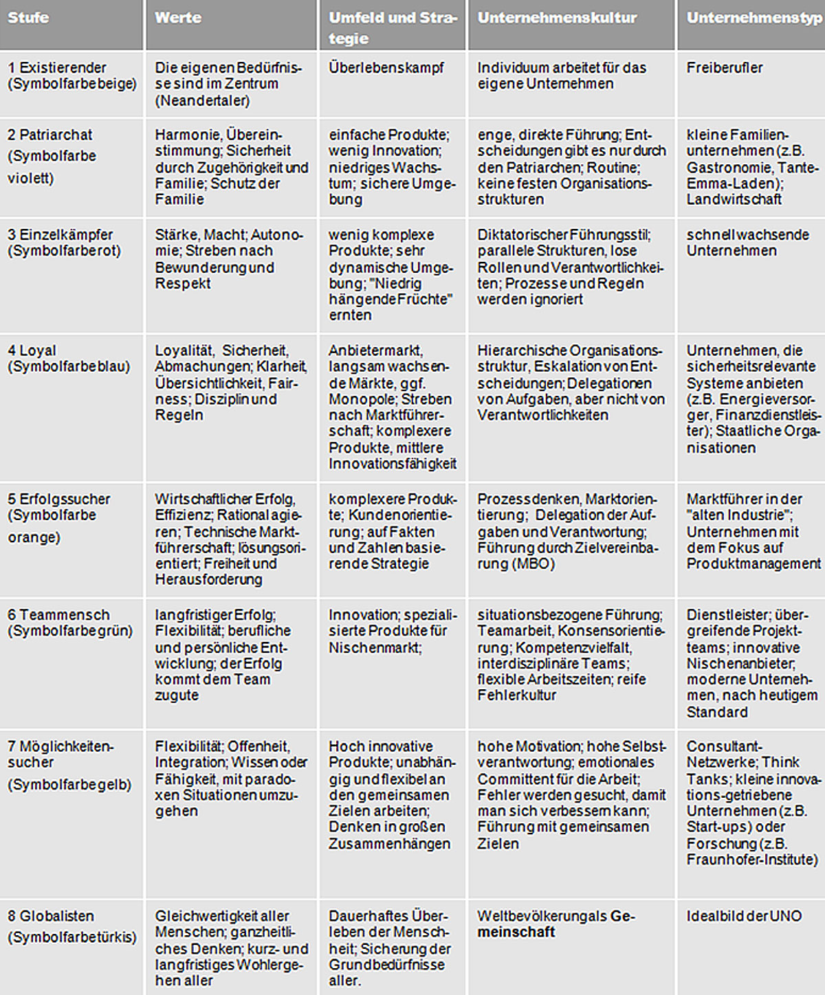 Bild 1 zeigt die acht Existenzstufen, die jeweils ein Wertesystem darstellen. Die Farbgebung ist Bestandteil des Modells – Berater, die das Modell anwenden, sprechen demgemäß z.B. von einem "orangen Unternehmen".