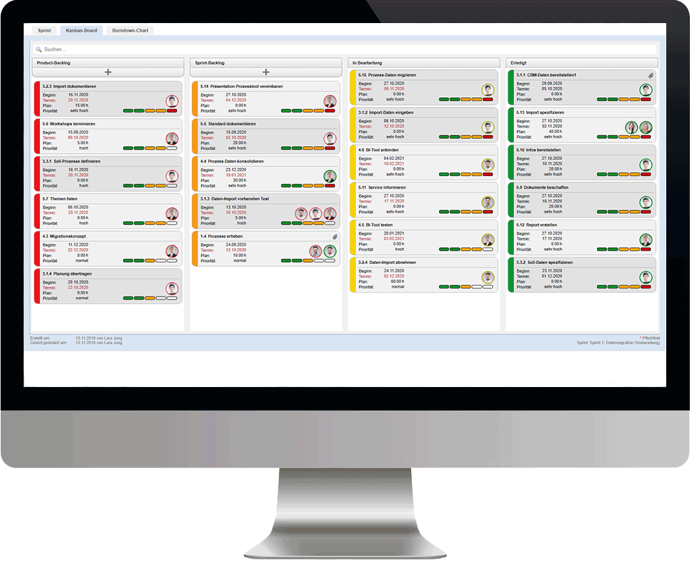 Ganz gleich durch welche Kriterien sich Ihre Projekte voneinander unterscheiden, in welchem Umfang Sie diese planen, nach welcher Methode Sie vorgehen oder ob Sie die klassische Planung mit Gantt-Diagramm oder ein agiles Vorgehen mit Kanban-Boards bevorzugen. Ihr gesamter unternehmensspezifischer Projektmanagement-Prozess wird durch unsere Software unterstützt: Von der Projektentstehung über die Projektplanung und Projektdurchführung zum Projektabschluss bis hin zur projektübergreifenden Steuerung im Multiprojektmanagement.