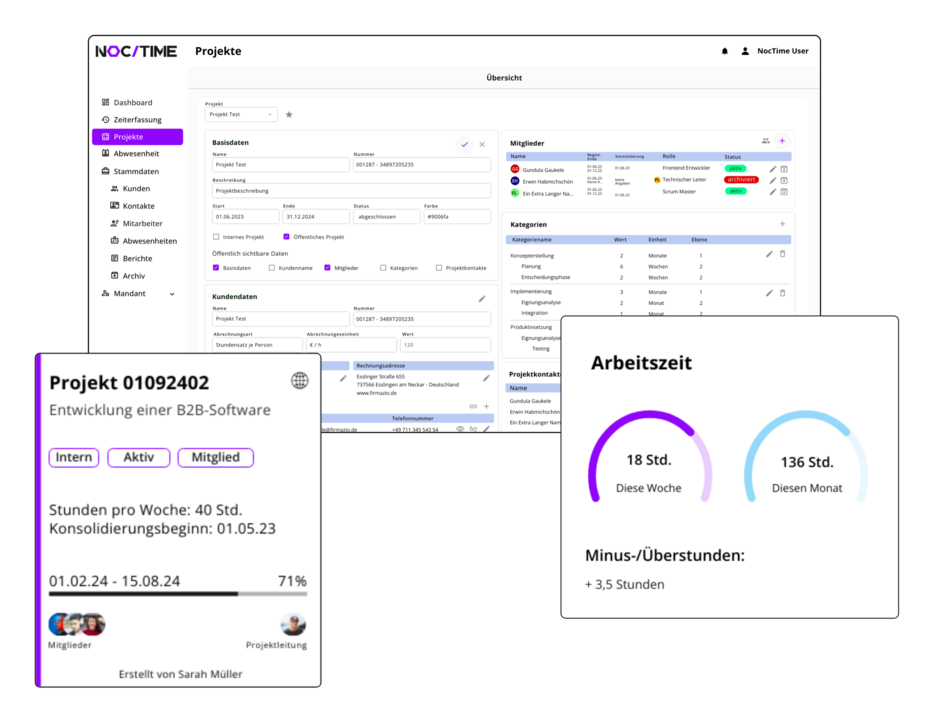 Web-basierte Zeiterfassung, Projektzeit- und Arbeitszeiterfassung, verschiedene Vertragstypen und Arbeitszeitmodellen, Berechnung von Überstunden, Abwesenheitsverwaltung mit Benachrichtigung, Projektverwaltung, Benutzerverwaltung, anpassbare Module.