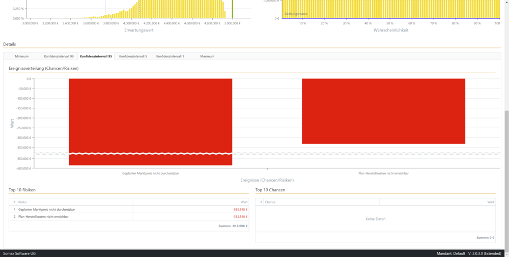 Definieren Sie beliebige Risikokataloge, strukturieren Sie diese und führen eine quantitative Bewertung durch. Simulieren sie durch Risikoaggregation ein mögliches Gesamtschadensbild in Bezug auf die definierten Risiken. Identifizieren Sie die Top Risiken oder Chancen anhand festgelegter Konfidenzintervalle und bewerten Sie Ihre Risikotragfähigkeit in Bezug auf die Gesamtschadenshöhe.