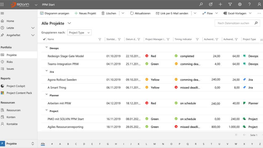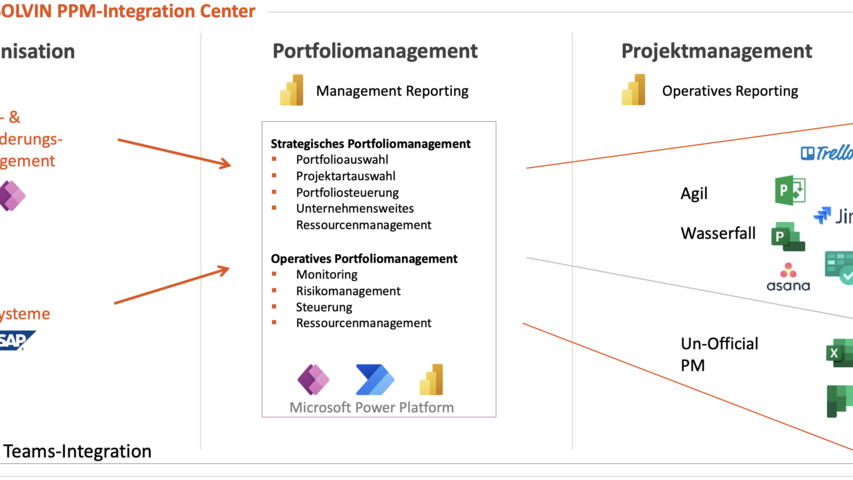 Für die übergreifende Projektportfolio-Planung und Steuerung werden Projekt-Metadaten aus den einzelnen Werkzeugen in die zentrale PPM-Plattform integriert, basierend auf Microsoft Power Platform. Fehlen Funktionen in einzelnen Werkzeugen, wie z.B. die Verwaltung von Projekt-begleitenden Informationen oder Ressourcenmanagement im Planner, Dokumentenmanagement oder auch Risikomanagement, werden diese durch die zentrale Integrationsplattform bereitgestellt.