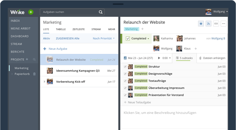 Wrike ist eine cloud-basierte Projektmanagement- und Collaboration-Lösung, die Unternehmen dabei unterstützt, kontinuierlich exzellente Ergebnisse beim Planen, Verwalten und Ausführen von Projekten zu erzielen.