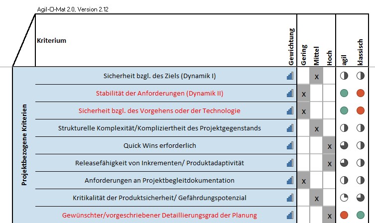 Die im Agil-O-Mat enthaltenen Kriterien beziehen sich auf besondere Charakteristiken und Anforderungen von agilem und klassischem Projektmanagement, sind aber nicht an ein bestimmtes Framework oder an die Vorgaben eines speziellen Projektmanagement-Standards gekoppelt.