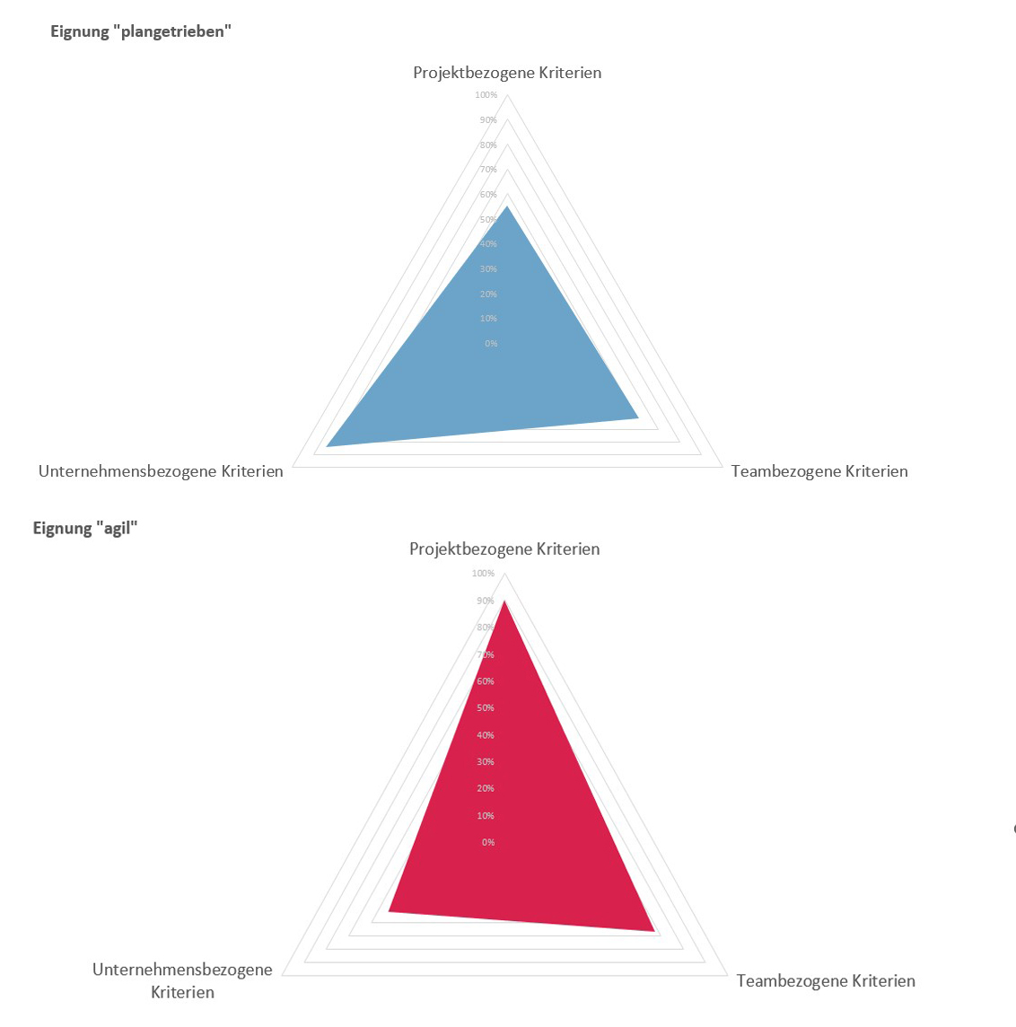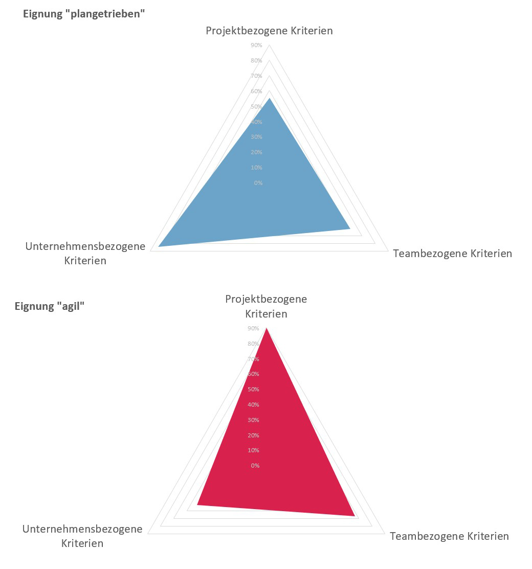 Die beiden Netzdiagramme enthalten detailliertere Auswertungen: Das blaue Diagramm zeigt die Bewertungen in Bezug auf das klassische Vorgehen (Bild 3 oben), das rote Netzdiagramm die Bewertungen im Hinblick auf agile Projektmanagementansätze (Bild 3 unten). In diesem Beispiel spricht die Bewertung der unternehmensbezogenen Kriterien für den Einsatz einer klassischen, plangetriebenen Vorgehensweise. Die projektbezogenen Kriterien zeigen dagegen, dass sich eine agile Vorgehensweise eignen würde. Auch die teambezogenen Kriterien sprechen eher für einen agilen Ansatz.