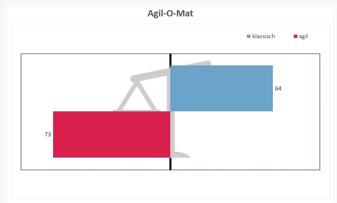 Die Waagegrafik veranschaulicht das Gesamtergebnis, an dem sich eine erste Tendenz hin zu agilem oder klassischem Projektmanagement ablesen lässt (Bild 2).