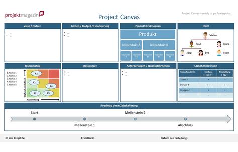 Eine ausführliche Anleitung, wie Sie einen Project Canvas erstellen, erhalten Sie in der Methodenbeschreibung des projektmagazins: -> Project Canvas.