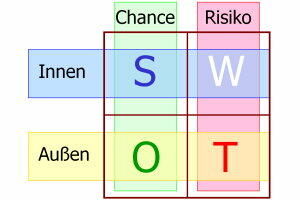Die SWOT-Analyse ist ein Werkzeug zur Strategieentwicklung. Im Rahmen einer SWOT-Analyse wer-den Stärken und Schwächen des eigenen Unternehmens sowie Chancen und Gefahren des Umfelds bestimmt und einander gegenübergestellt. Ihr Zweck ist, Strategien zu entwickeln, um bestehende Probleme zu lösen und Chancen zu nutzen. Die Abkürzung SWOT steht dabei für Stärken (Strength), Schwächen (Weakness), Chancen (Opportunities) und Risiken (Threads). Mit Hilfe der SWOT-Analyse wird sowohl der eigene Status reflektiert (Innensicht) als auch die zentralen Einflüsse des Umfelds bestimmt (Außensicht).